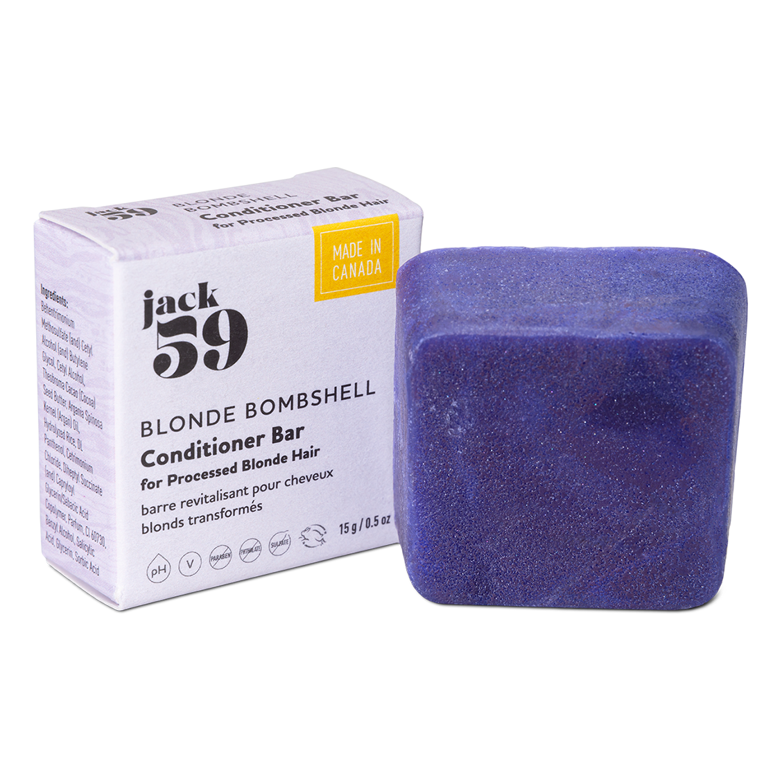 Keep your color vibrant on the go with Jack59's Blonde Bombshell Conditioner Travel Buddies Singles. This best conditioner for color treated hair provides moisture-rich toning and conditioning without staining. This compact travel size conditioner bar and hair conditioner bar is perfect for maintaining cool tones or as a refill for your Weekend Edition Travel Set.