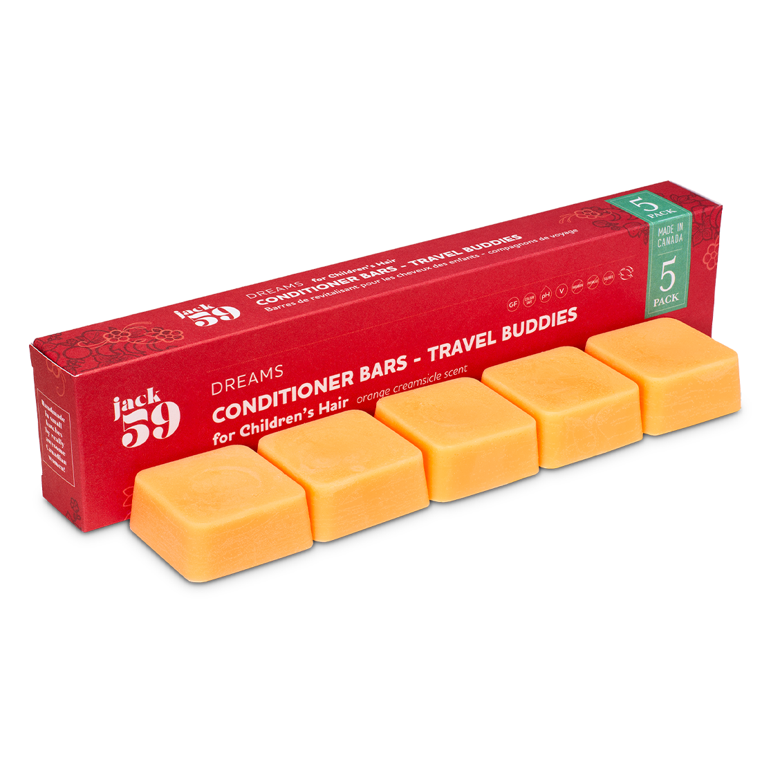 Easy detangling on the go with Jack59's Dreams Conditioner Travel Buddies 5-Pack Refill. These natural hair conditioners feature a sweet Orange Creamsicle scent kids love and deeply nourishing ingredients for tangle-free results. These compact travel size conditioner bars and hair conditioner bars are perfect for family travel or for restocking your Weekend Edition Travel Set.